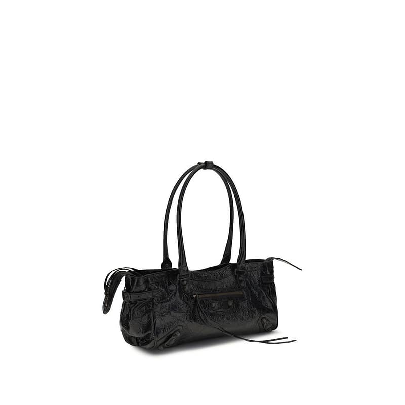The Le City East-West Shoulder Bag by Balenciaga combines urban style with functionality. Featuring two clip-on straps, it can be comfortably carried over the shoulder, while the brass hardware enhances its elegance. The zip closure with a knotted leather pull tab ensures security, complemented by a front zip pocket. Inside, a main compartment and a flat pocket offer practicality and organization, making the bag versatile and suitable for any occasion.