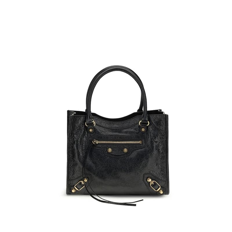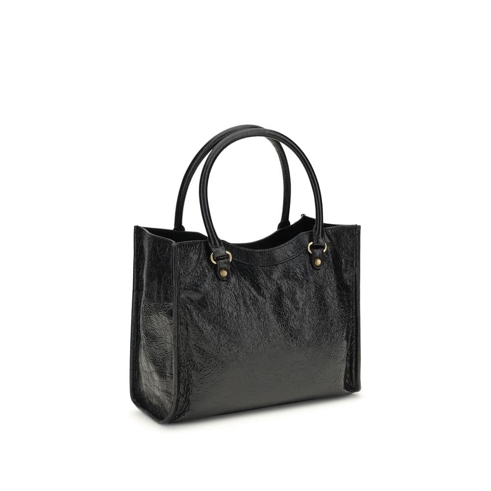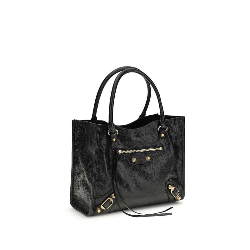 The Le City mini Tote Bag by Balenciaga is a versatile and refined accessory. Made from Arena lambskin, it features two handles, an adjustable and removable shoulder strap for hand or shoulder wear, brass hardware, a front zip pocket with knotted leather pull, magnetic closure, one main compartment, and an internal zip pocket, perfectly combining practicality with elegant style.