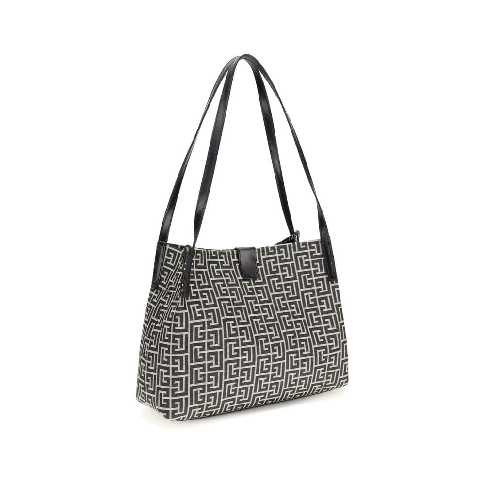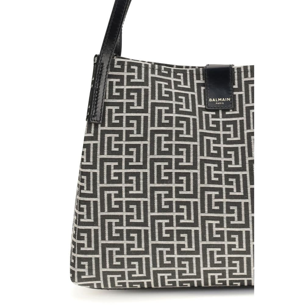 The jacquard and leather Tote Bag by Balmain is an elegant and functional accessory, featuring a distinctive geometric pattern that adds modernity to the design. Equipped with double handles, it offers comfortable portability both by hand and on the shoulder. The logo plaque on the front enhances its authenticity and luxury, while the top opening without closure ensures practicality and quick access to your belongings. Perfect for those looking for a mix of sophisticated style and everyday functionality.