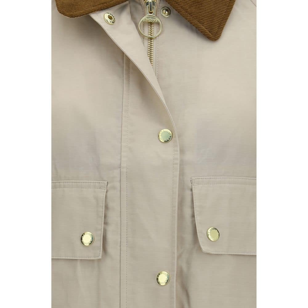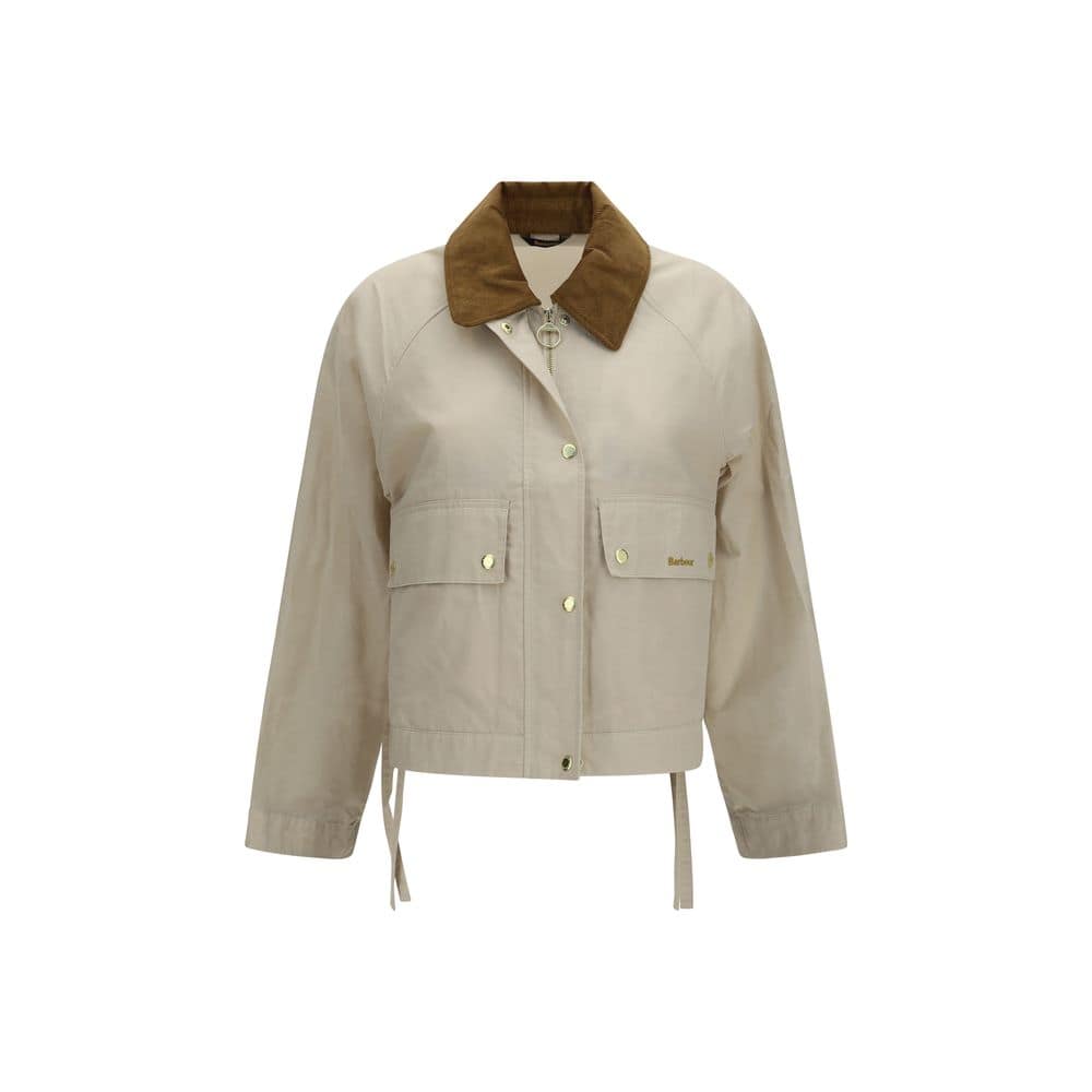 The Medland rain Jacket by Barbour stands out for a contemporary silhouette that reinterprets the classic archive Spey model with a modern approach. The jacket model by Barbour is crafted from a light beige cotton blend and features a thin ribbed brown collar that defines the structure of the garment. The cropped cut with a slightly longer back hem creates a balanced silhouette. Side fabric ties allow the fit to be adjusted, while the front zip and snap-button closure add practicality and protection. Flap pockets with snap buttons, adjustable sleeves and tartan turn-ups recall the brand’s iconic heritage. The Medland jacket by Barbour completes the design with a comfortable and contemporary fit.