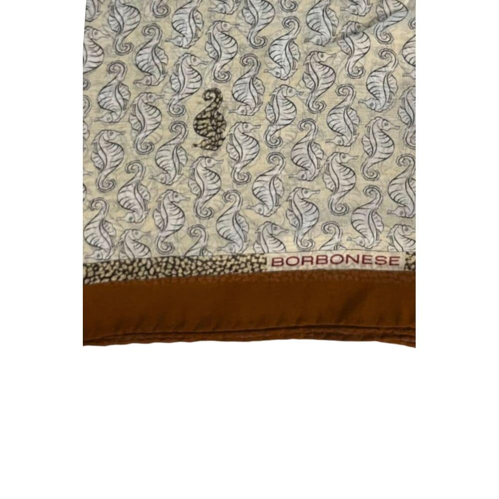 Wrap yourself in the epitome of Italian elegance with this Borbonese Silk Scarf, boasting a playful Seahorse print that exudes sophistication. The striking brown piping contrasts beautifully against the delicate fabric, framing the iconic Borbonese logo. At 90 cm by 90 cm, it’s the perfect accessory to accentuate any ensemble with a touch of bold, trendy flair.