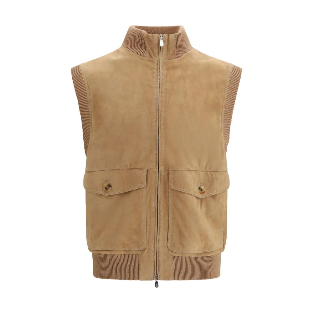The suede Vest by Brunello Cucinelli is a refined and functional garment, designed to combine elegance and comfort. It features a double-slider zip closure and a ribbed knit collar, while the ribbed knit bottom ensures a perfect fit. The double lower pockets, welt pockets with flaps and buttons, and two inside pockets with button closures, including a pen pocket, offer maximum practicality. Thermore® padding and cupro lining complete the garment, ensuring warmth, comfort, and a touch of understated luxury.