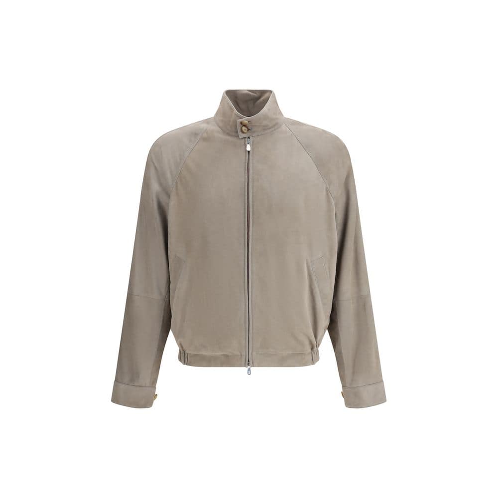 The suede leather Jacket in with zip by Brunello Cucinelli embodies tactile elegance with a contemporary edge. Crafted from soft suede, it features a front zip fastening, side welt pocket and hems finished with calfskin buttoned details that highlight its artisanal refinement. A sophisticated piece combining character with understated luxury.
