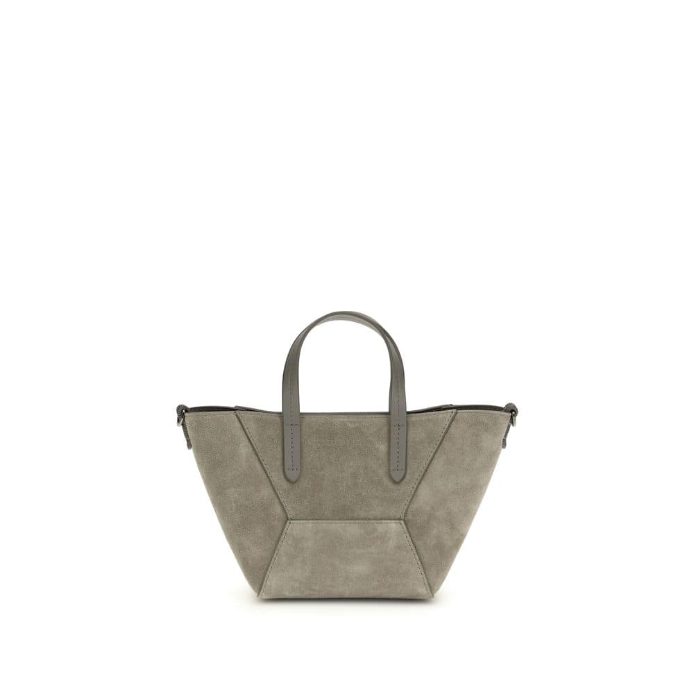 The suede leather Shoulder Bag by Brunello Cucinelli combines craftsmanship and sophistication. Featuring two top handles and an adjustable and removable flat shoulder strap, it offers versatility and comfort. The paneled design enhances the elegant structure, while the iconic monogram on the front panel adds a distinctive touch. The interior magnetic button closure ensures practicality, and the iconic shiny jewels on the side panels lend brightness and sophistication. The single interior compartment ensures space and functionality, perfect for discreet and timeless elegance.