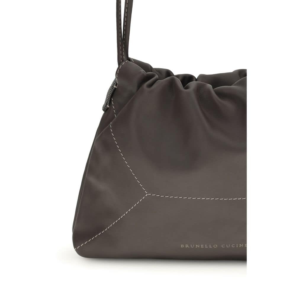 The leather Shoulder Bag by Brunello Cucinelli combines refined style with everyday practicality. Featuring a drawstring closure, visible stitching, and a printed logo on the front, it is completed by a shoulder strap that guarantees versatility and comfort, making it ideal for an elegant and contemporary look.