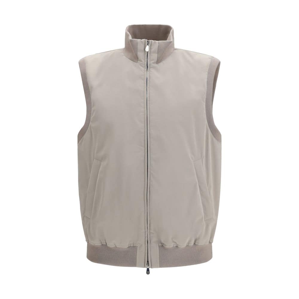 The sleeveless Vest Jacket by Brunello Cucinelli is an elegant and functional piece featuring a two-way front zipper and welt pockets on both sides of the front. The hem is finished with an elastic band for a comfortable fit, while the armhole edges are crafted in ribbed fabric. The slightly raised ribbed collar adds structure and a refined touch to the design.