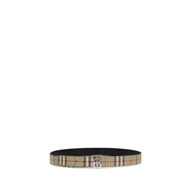 The TB reversible Check Belt by Burberry is a versatile and sophisticated accessory. Crafted with a smooth leather interior, it can be worn on either side, featuring the classic check pattern on one side and a simpler design on the other. The palladium-plated buckle, featuring the Thomas Burberry monogram, adds a touch of elegance. The hand-painted edges complete the design, making this belt a must-have for those seeking style and functionality.