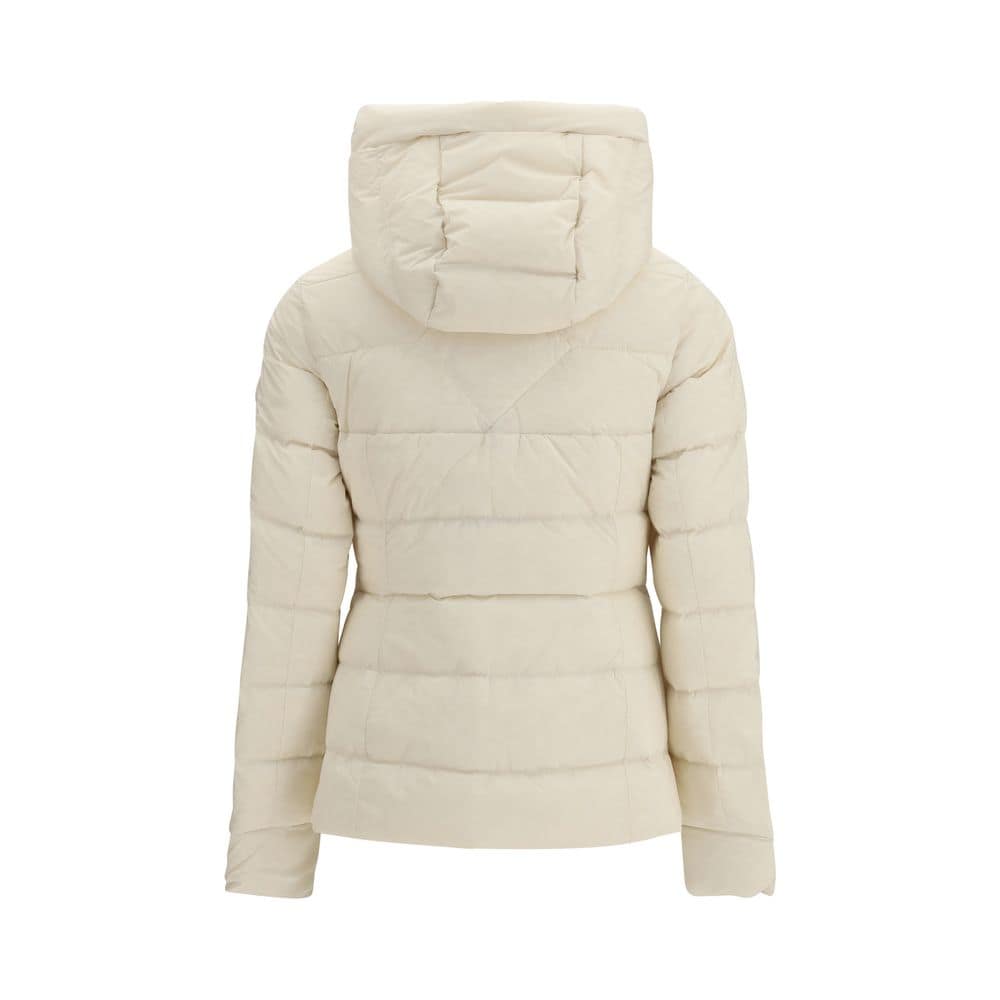 The Clair Jacket by Canada Goose, in an elegant cream shade, is crafted from Aira, a durable bi-stretch fabric with a matte finish. It features an adjustable snorkel hood with drawstring and a two-way front zipper with a tricot chin guard for enhanced comfort. Internal carrying straps allow it to be worn hands-free like a backpack. Power Stretch® cuffs help retain warmth, while fleece-lined zippered side pockets provide added protection. The design is completed by a practical interior pocket, 750 fill power down insulation, and a tonal logo on the left sleeve. Regular fit.
