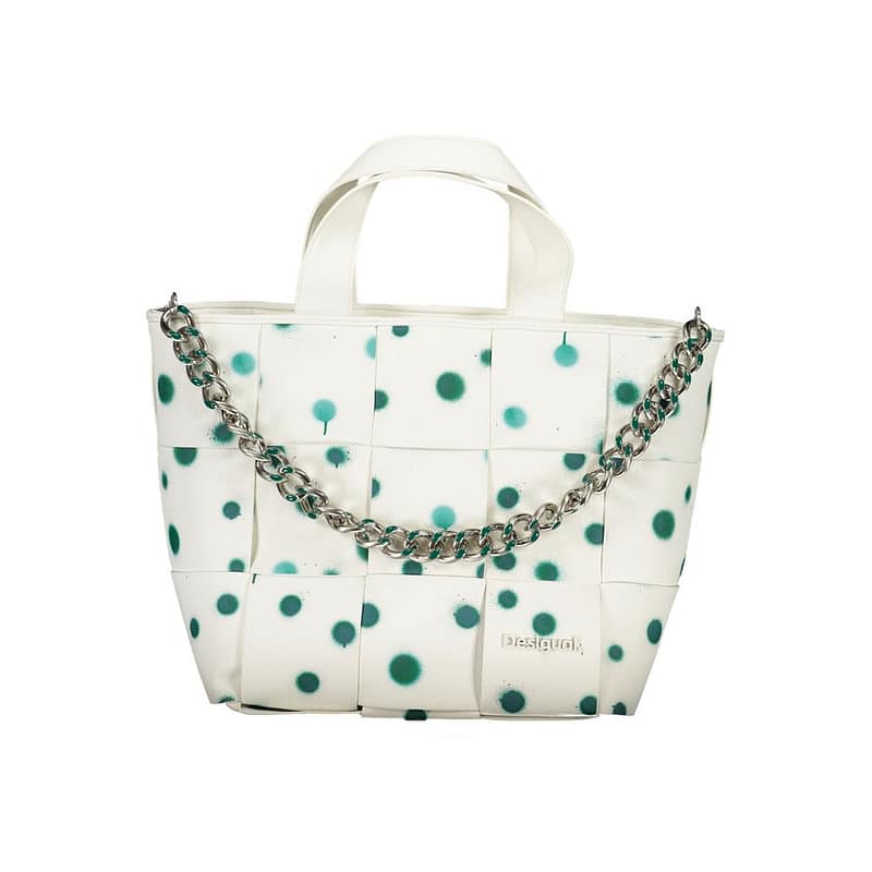 Dive into the world of DESIGUAL with this chic white handbag, perfect for the fashion-forward individual. Exquisitely crafted from 100% Poliuretano for a luxurious feel, it showcases a versatile design featuring two handles, a removable chain shoulder handle, plus an adjustable and detachable strap for varied styling options. Its secure zip closure opens to reveal an internal pocket, while the contrast details and prominent DESIGUAL logo elevate the bag’s trendy allure. It’s a statement piece that effortlessly transitions from day-to-night.