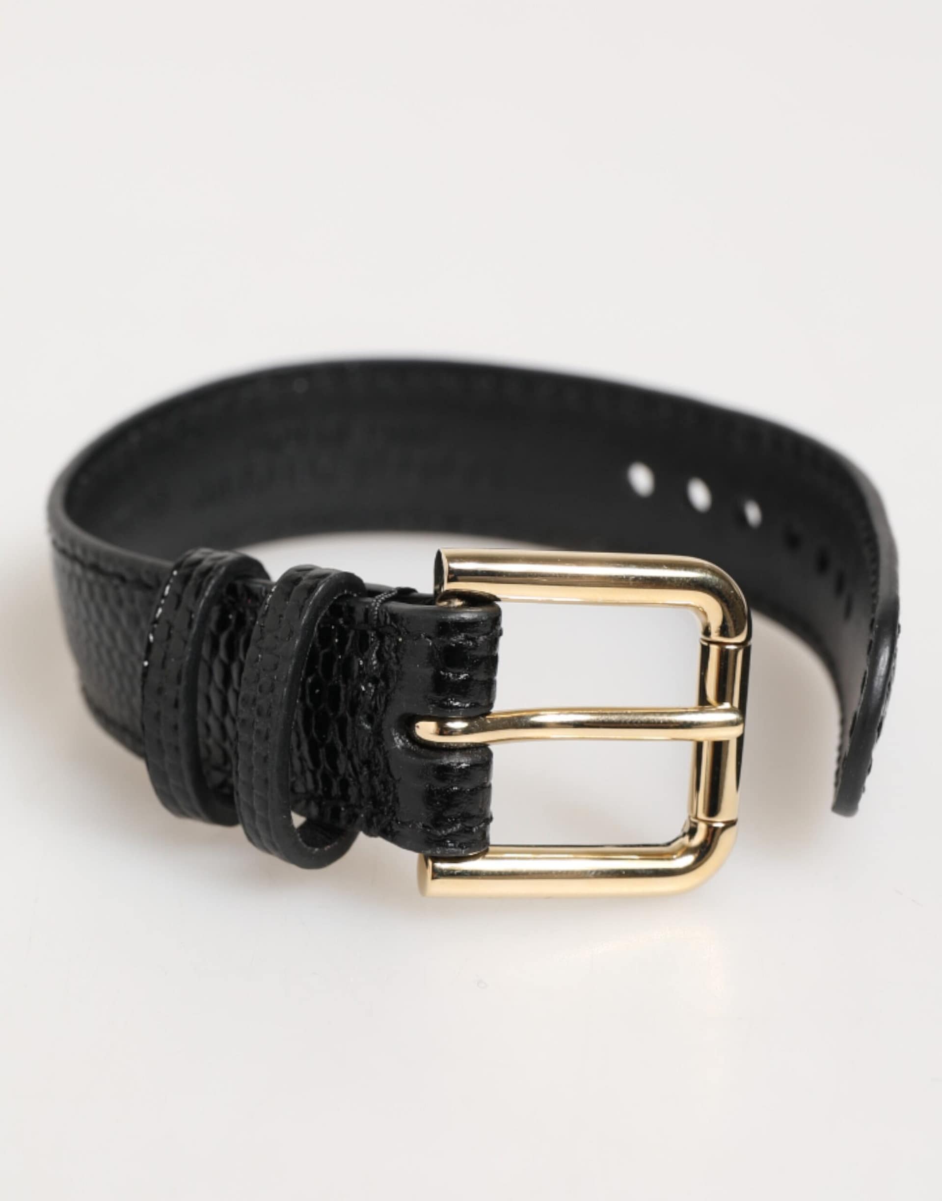 Gorgeous brand new with tags, 100% Authentic Dolce & Gabbana bracelet. This luxury piece features a sleek black embossed leather strap with a polished gold-tone buckle closure, adding a refined touch to any outfit. Perfect as a stylish everyday accessory or as a statement piece for special occasions.