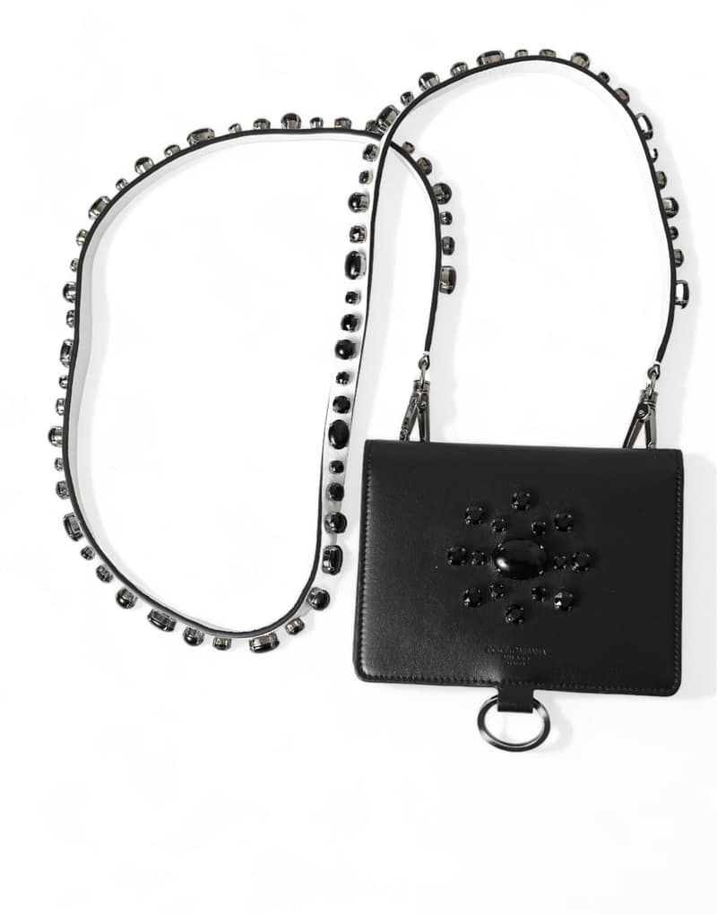 Gorgeous brand new with tags, 100% Authentic Dolce & Gabbana Black calf leather cardholder featuring crystal embellishment, snap-button fastening, internal card slots and detachable neck strap.