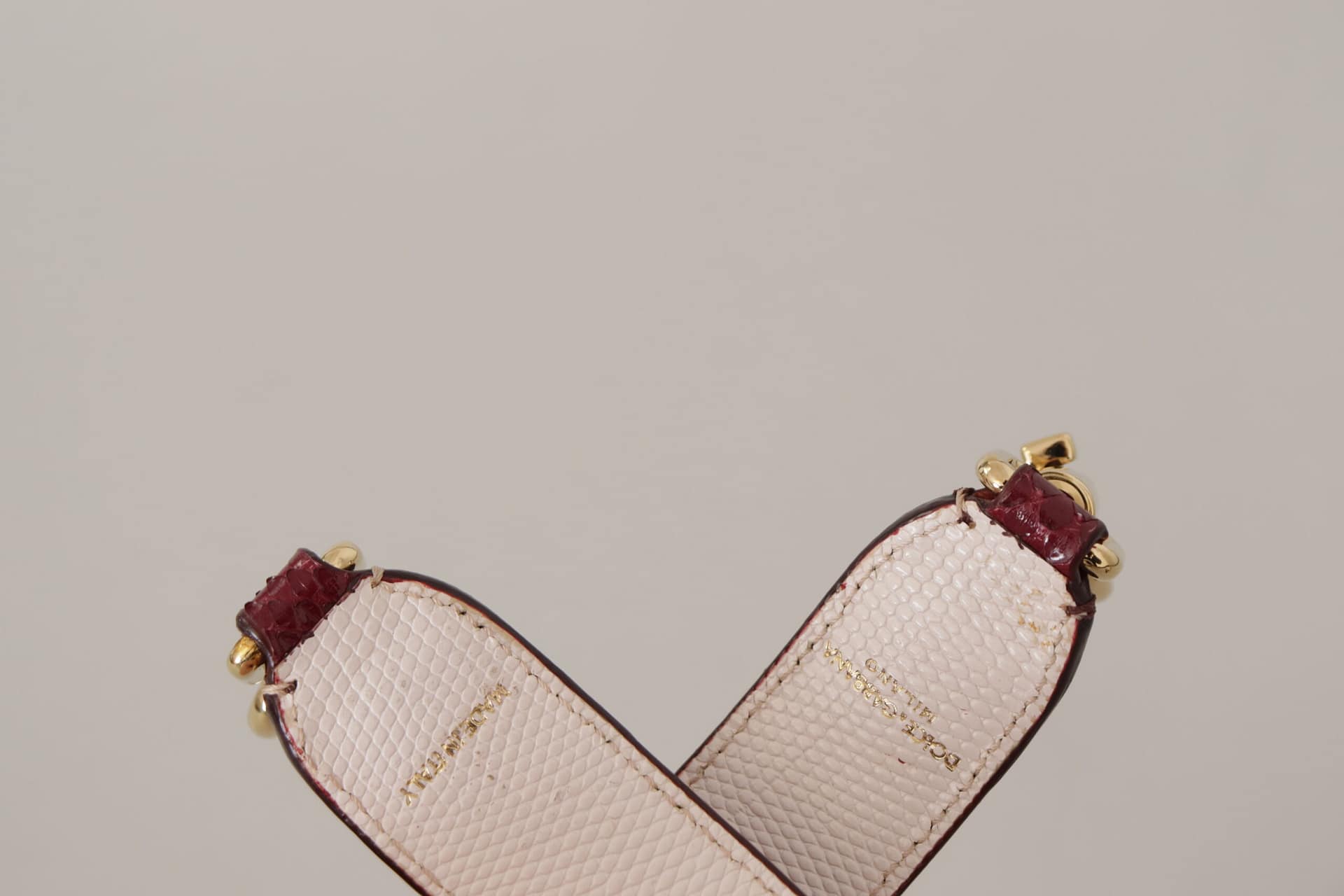 Gorgeous, brand new with tags 100% Authentic Dolce & Gabbana shoulder bag strap that you can flaunt with your great collection of handbags. The strap is made of leather in a pretty red hue. It is complete with two gold-tone lobster clasps for you to attach them to your bags.