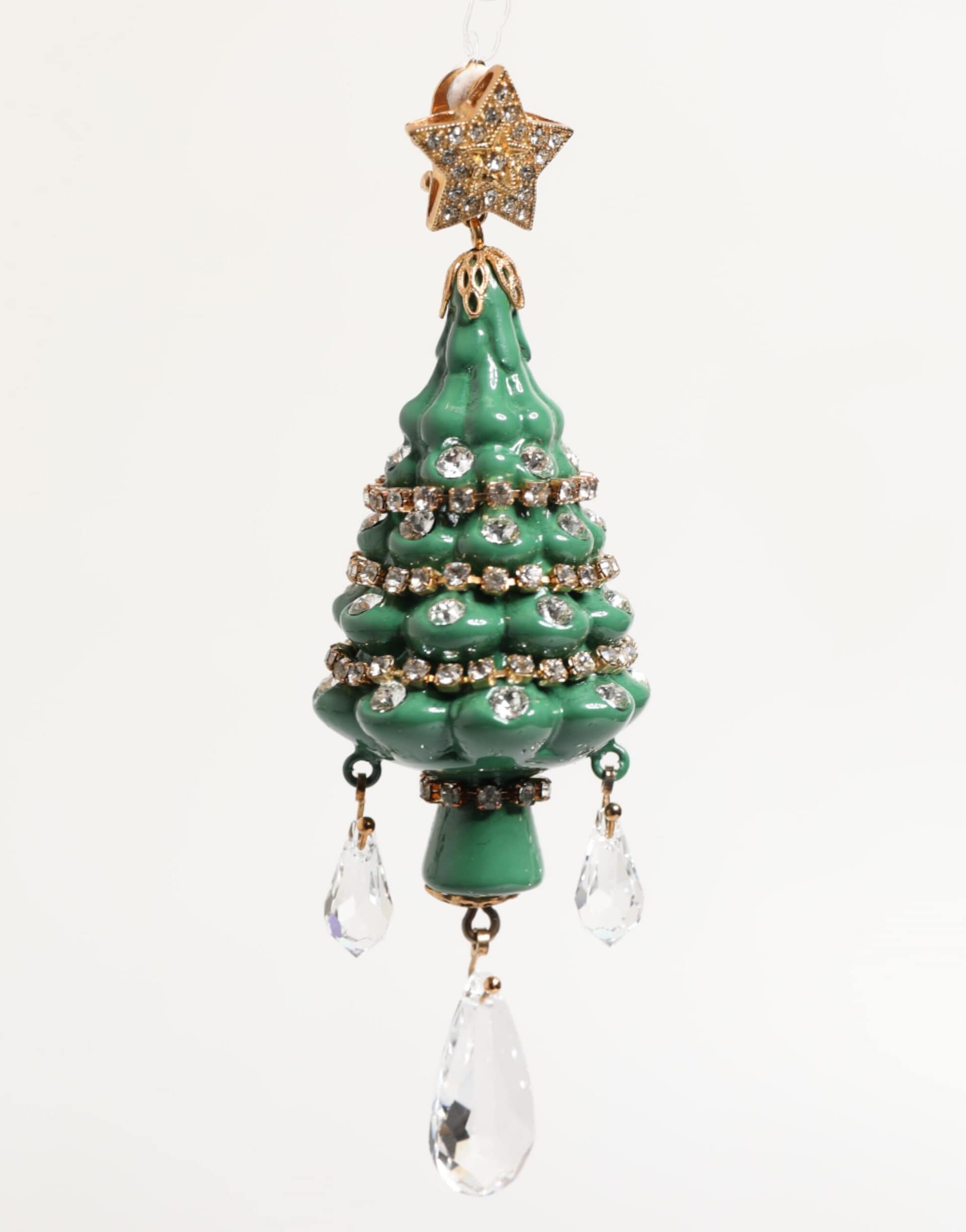 These festive statement earrings are crafted in gold-tone brass and decorated with vibrant green enamel, crystal embellishments, and sparkling star studs. Finished with dangling teardrop crystals for added