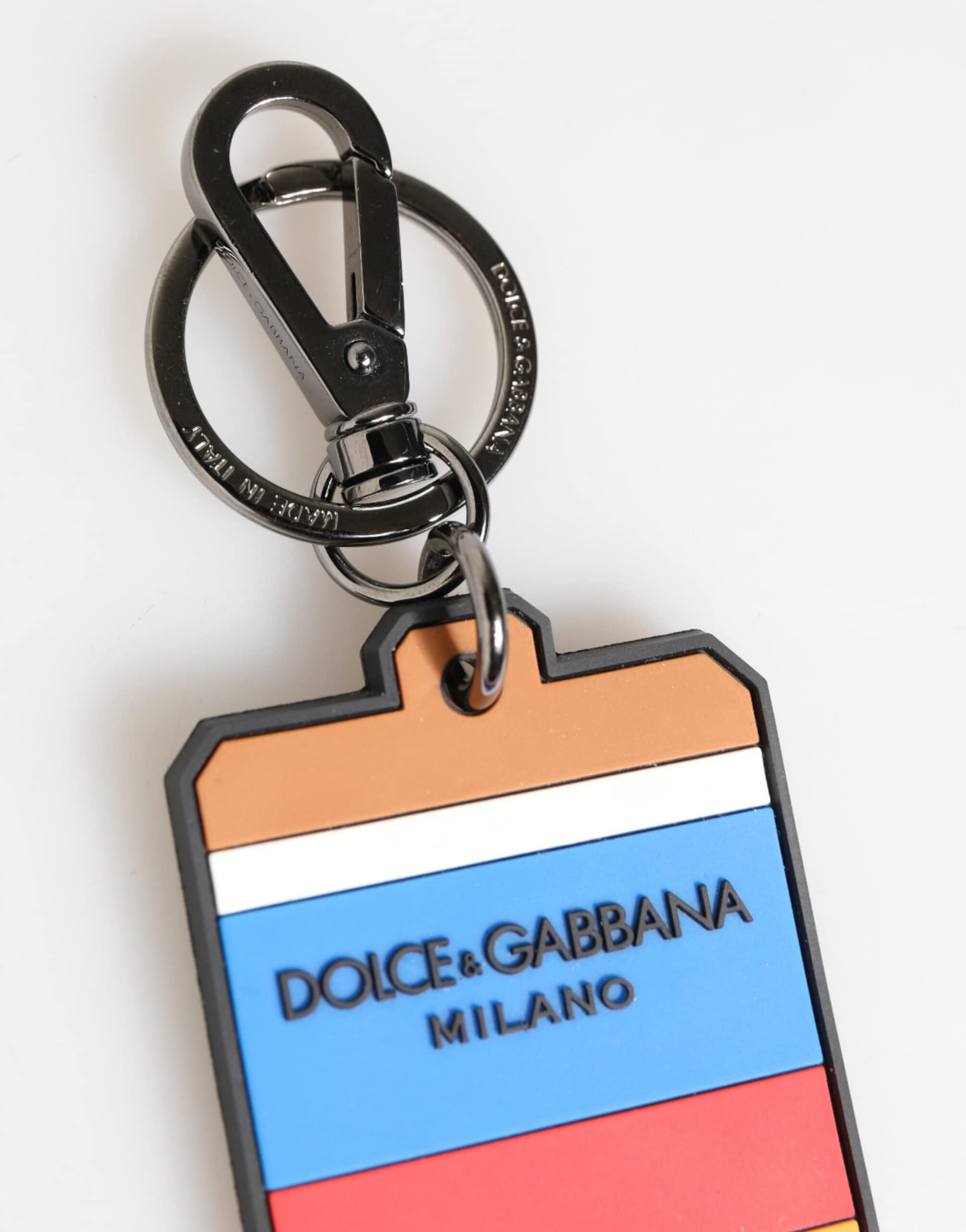 Gorgeous brand new, 100% Authentic Dolce & Gabbana Keyring features a silver brass ring, DG logo rubber and logo engraved metal hardware.