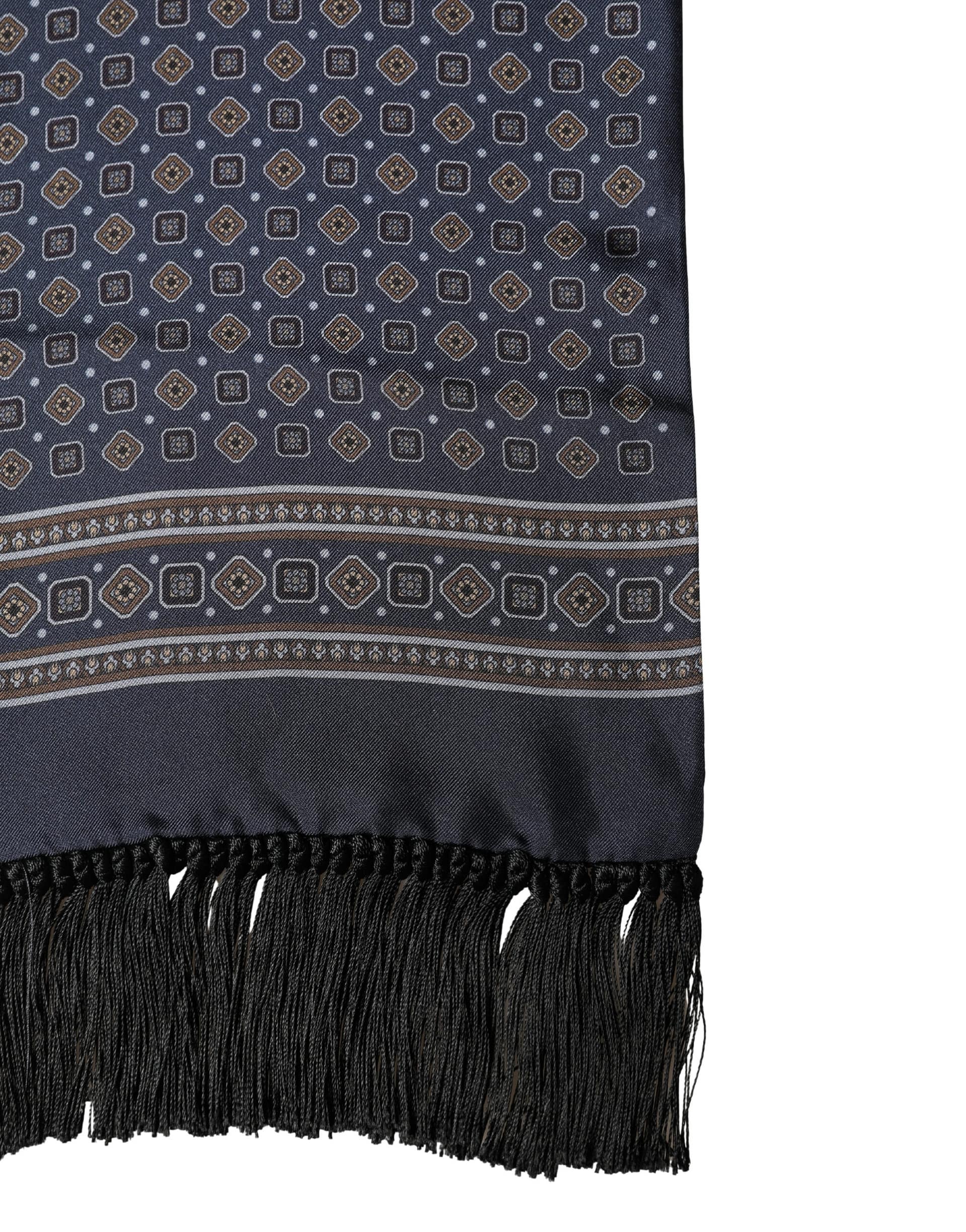 Dolce & Gabbana Navy Silk Geometric Fringe Foulard 137cm x 18cm Scarf