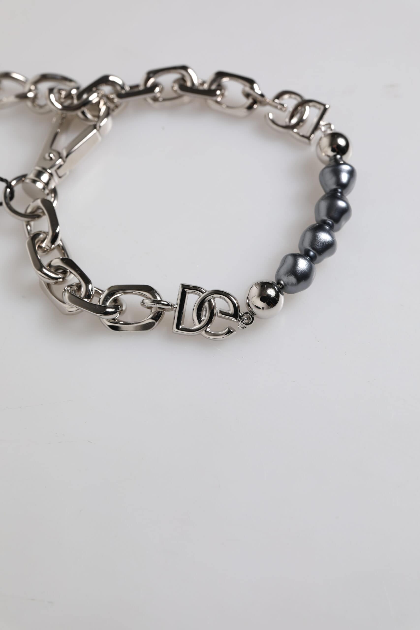 Gorgeous brand new with tags 100% Authentic Dolce & Gabbana silver-tone chain bracelet, a perfect blend of elegance and contemporary edge. Featuring an intricate mix of polished metal links and signature DG logo details, this statement piece is adorned with lustrous dark-hued pearls for a refined yet modern touch. The adjustable lobster clasp ensures a comfortable and secure fit, making it an ideal choice for both casual and formal occasions.