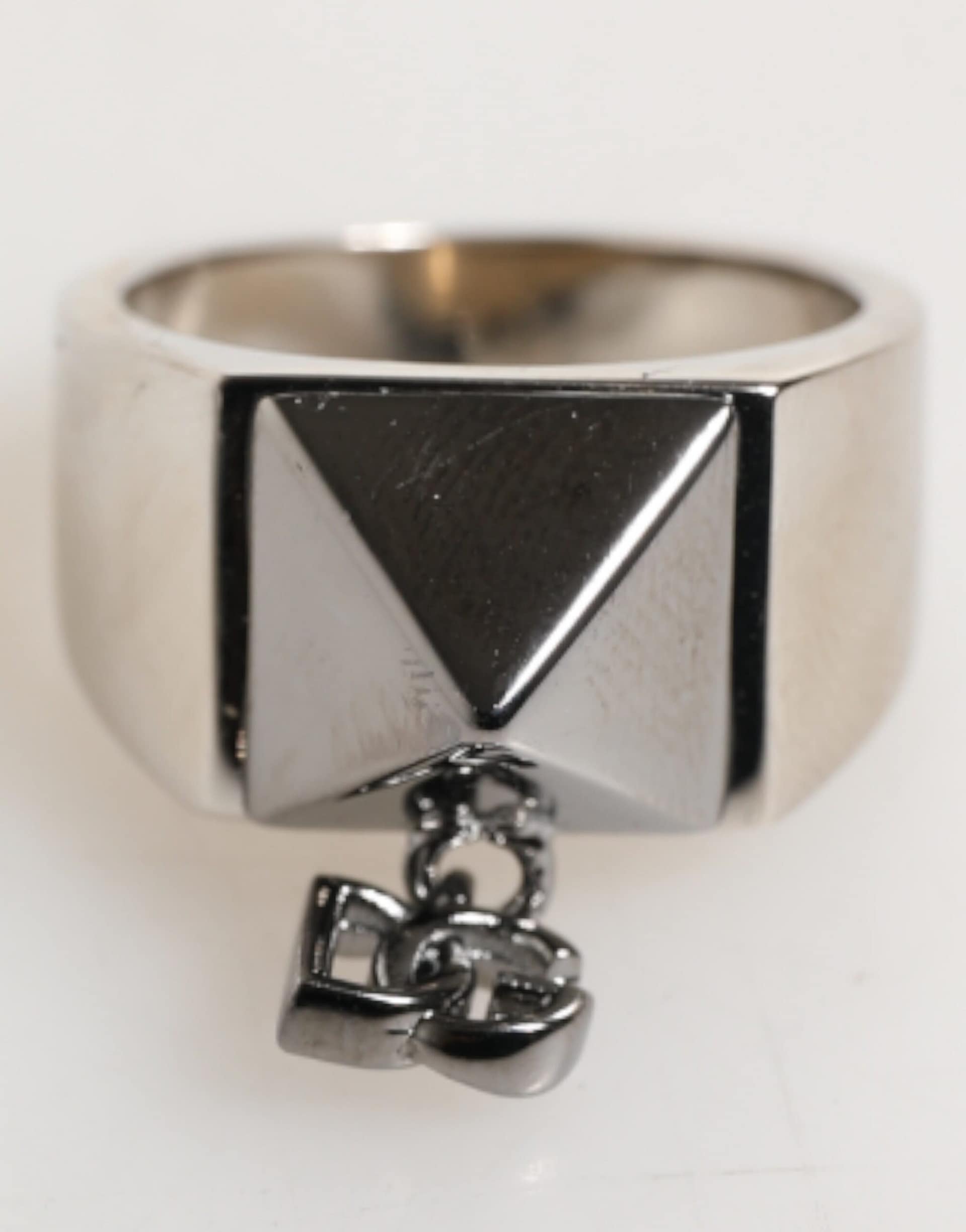 Features a bold silver-tone pyramid design crafted from real brass, accented with the iconic DG logo for a modern, edgy look. The geometric shape and polished finish make this a standout piece perfect for elevating any outfit.