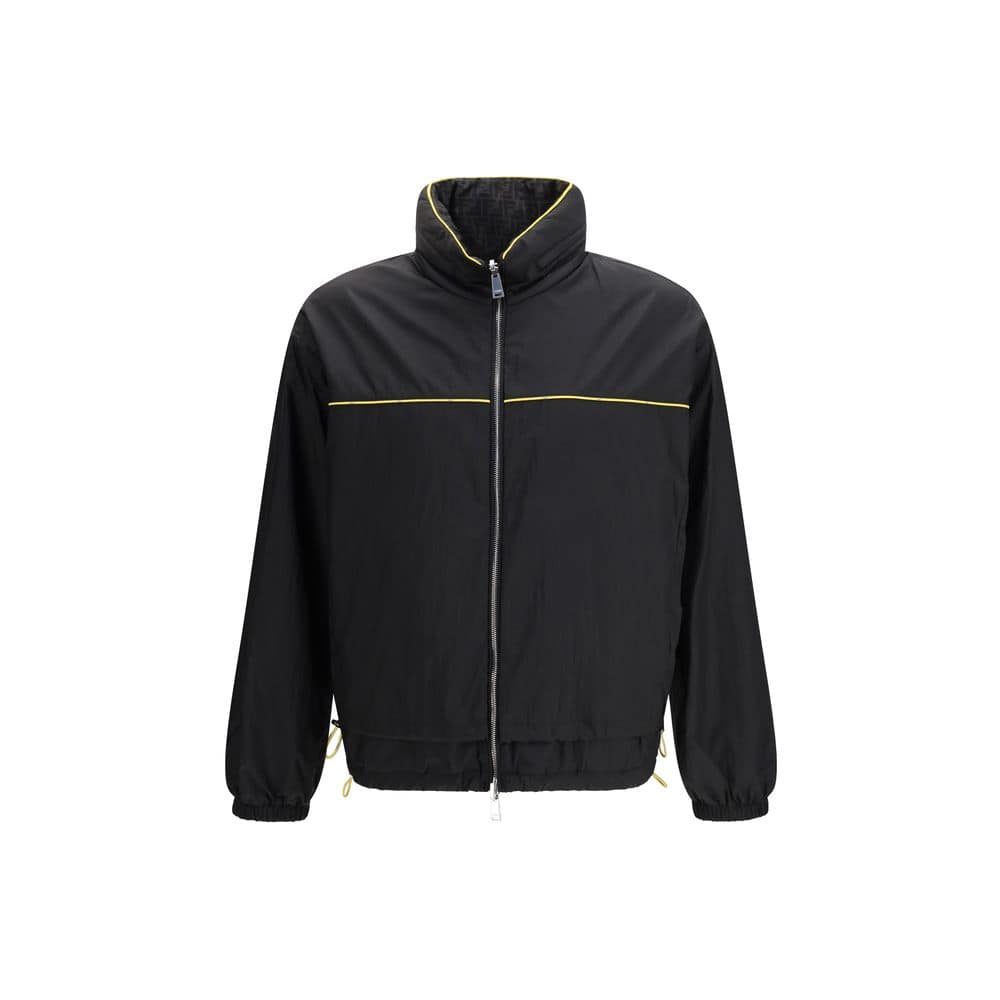 The FF jacquard zipped reversible Windbreaker by Fendi is a versatile and statement-making piece. Featuring an all-over FF jacquard pattern with geometric embroidery, it is designed with a drawstring hood, front zip fastening, and elasticated hems for a comfortable fit. The reversible construction offers two different looks in one, blending functionality with signature style.