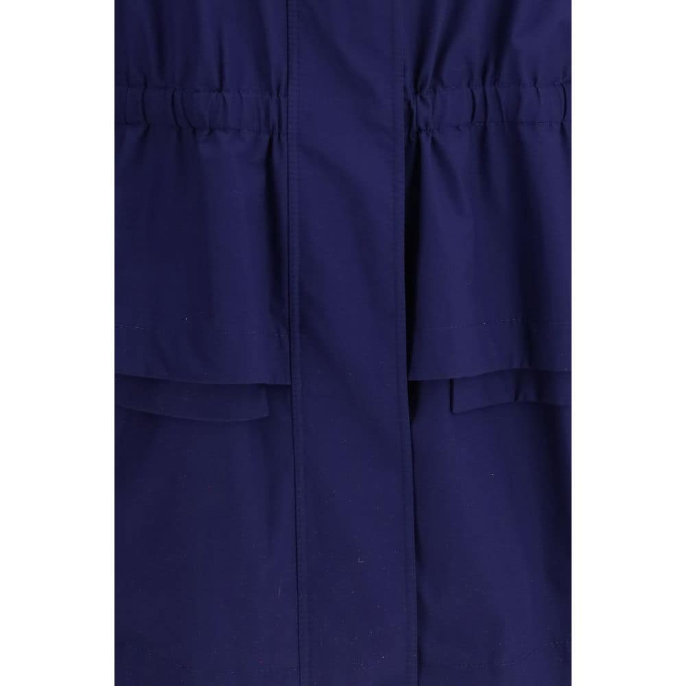 The midi poplin Parka Blouson in cotton with logo embroidery by Fendi features a high neck and wide low-set sleeves that define a contemporary silhouette. The fit can be adjusted through an elastic strap inserted at the waist with buttonhole regulation, allowing a softly puffed effect. Waist, side and peplum pockets enhance structured functionality, while the center-back slit and concealed double-slider zip closure complete the design. Godet details at the sides and Fendi embroidery on the left sleeve cuff add a distinctive and refined signature aligned with the brand’s identity.