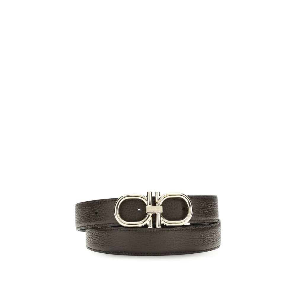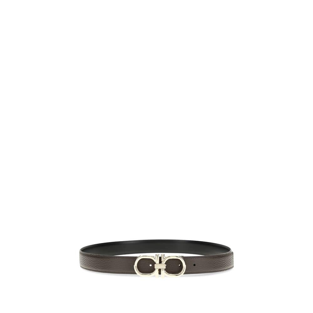The reversible and adjustable Gancini Belt by Ferragamo combines practicality and style, with a stitched arm for a casual look. The gold-tone buckle features a stylized double Gancini in a single metal strand, complemented by a center plaque with an engraved signature. The adjustable length ensures a personalized fit and style; please consult the size guide for additional information.