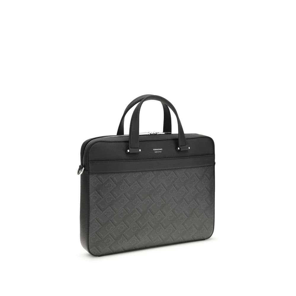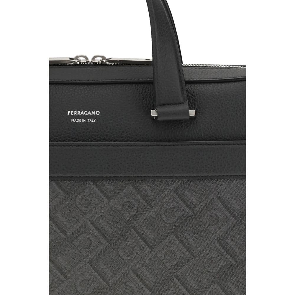 The Monogram Work Bag by Ferragamo is an elegant and practical accessory, designed for those seeking a balance between style and functionality. Crafted from hammered calfskin, with technical canvas panels and the Ferragamo monogram printed on it, this business bag stands out for its sophisticated design. The metal zippers reveal a well-organized interior, ideal for personal items and digital devices. The jacquard fabric shoulder strap and rear straps for attaching it to a trolley offer extra comfort, making it perfect for business trips and busy days.