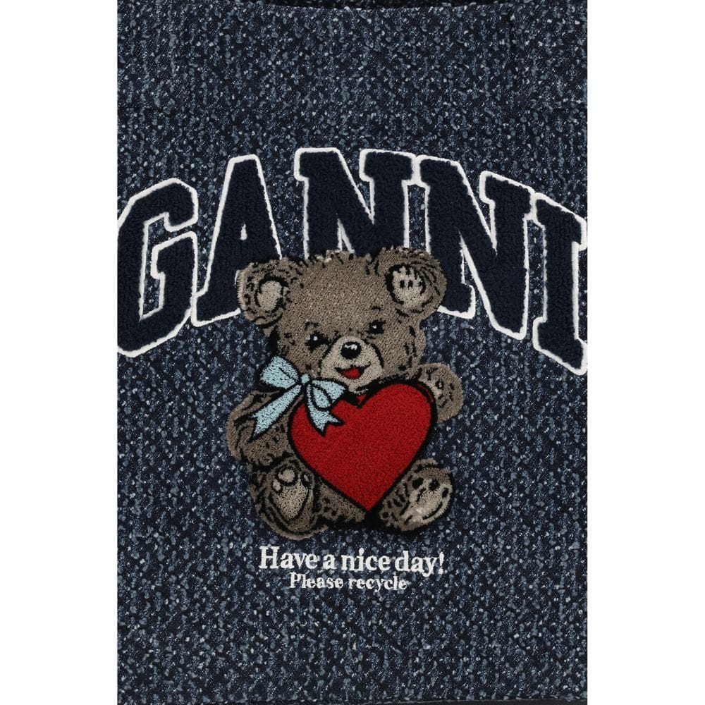 The medium denim Tote Bag with bear by Ganni is a versatile and contemporary accessory, featuring a durable denim weave and the iconic Ganni logo. Equipped with top handles, it has a spacious single compartment and a practical internal zippered pocket to better organize your essentials.