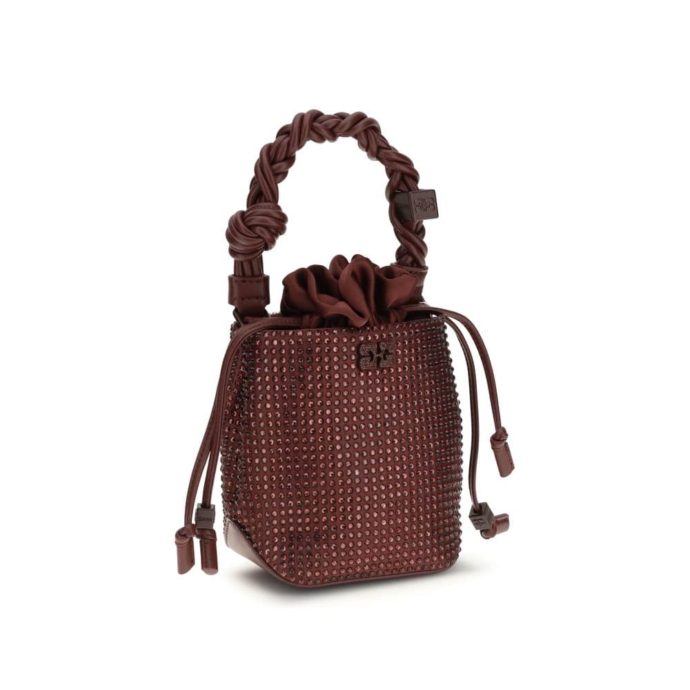 The mini Bou Buckle Bag by Ganni with Rhinestones is a little gem of style, entirely studded with tone-on-tone rhinestones. It features a braided top handle with knot detail and an adjustable, removable shoulder strap that adds to its versatility. Completing the design is an internal drawstring clutch bag, embossed logo on the back and a flat pocket for a compact yet character-filled accessory.