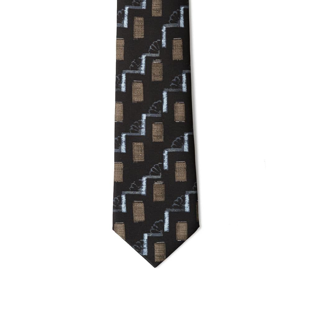 Black silk tie by Giorgio Armani featuring multicolor geometric patterns.