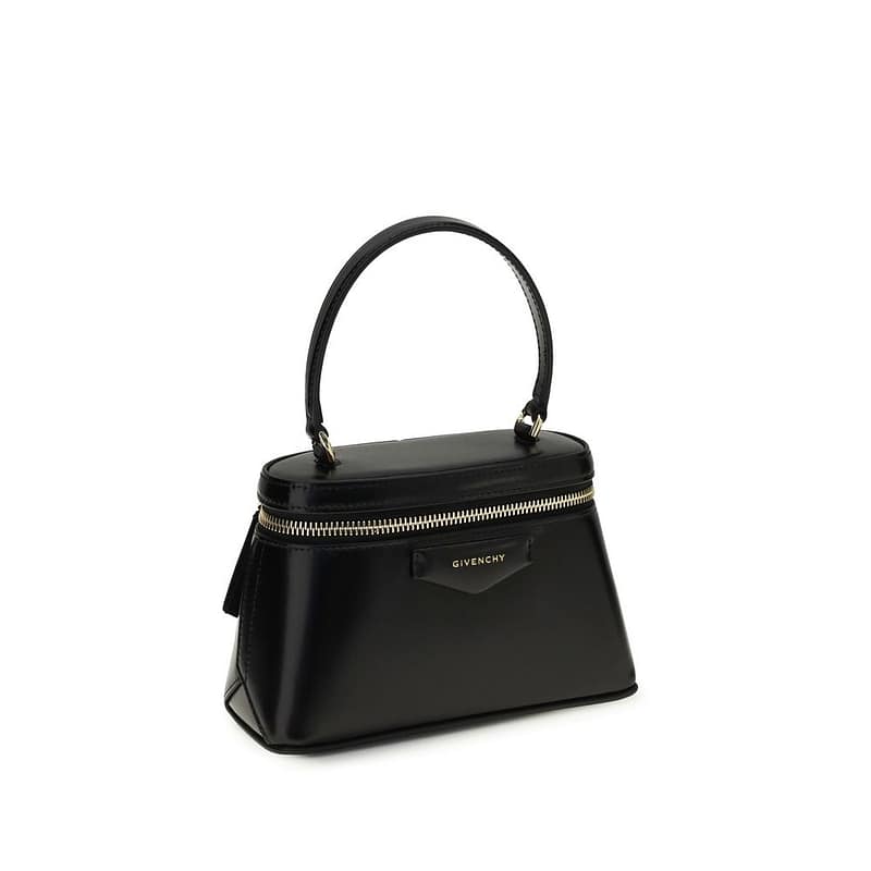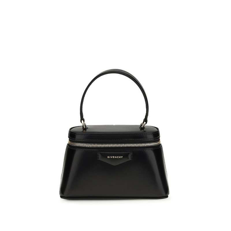 The Antigona Mini Handbag by Givenchy combines elegance and functionality in a compact design. Crafted with leather handles for carrying by hand and a removable metal chain with leather trim for wearing over the shoulder, it features a zipper closure and gold-tone metal hardware. The front features a pentagonal appliqué with an embossed GIVENCHY signature, while the interior, bearing the Givenchy Paris signature, includes a main compartment and a card slot, perfect for organizing your personal items in style.