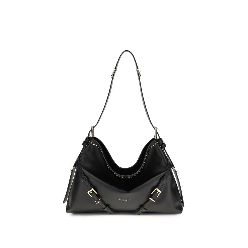 The large Voyou Shoulder Bag in shiny leather by Givenchy is an elegant and functional accessory, crafted from fine smooth calfskin leather with a soft V-shaped silhouette and generous proportions. Featuring an adjustable shoulder strap, it can be carried by hand, on the shoulder, or across the body. The embossed signature on the front and shoulder strap, together with the Paris appliqué inside and gold-finish metal buckles, add a distinctive touch. The main compartment and internal zip pocket ensure practicality and organization.