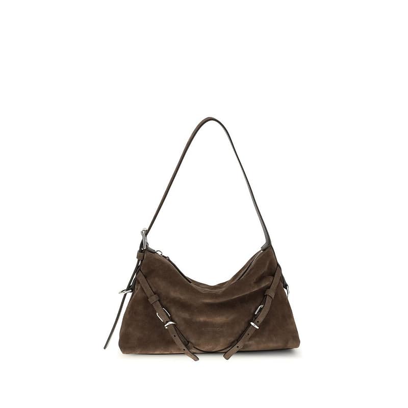 The Voyou Mini Shoulder Bag by Givenchy is a compact and sophisticated accessory made of suede leather. Featuring a zippered closure, it features an adjustable strap for comfortable shoulder wear. The brand’s embossed signature decorates the front, while the interior is embellished with the GIVENCHY Paris applique. Brand-engraved metal buckles and gold-tone metallic details complete the design. The main compartment offers essential space for everyday essentials.