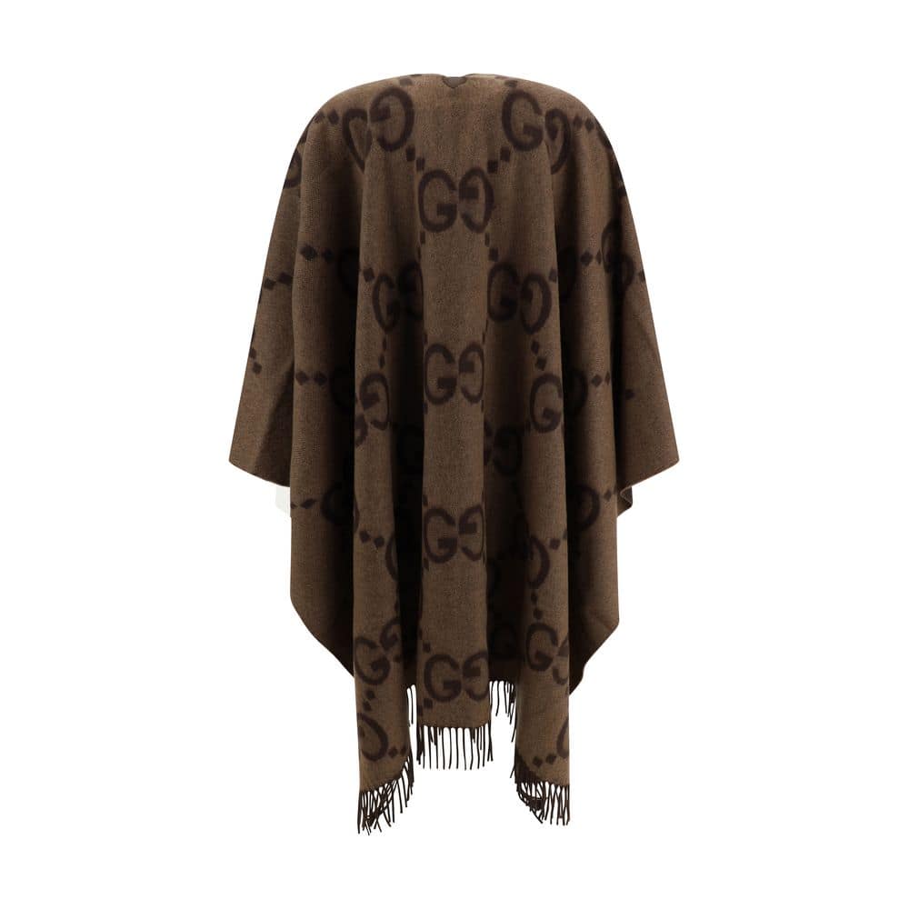 Cashmere Cape by Gucci, reversible cape design, shawl lapels, frayed hem, iconic all-over contrasting brand logo, oversized fit.