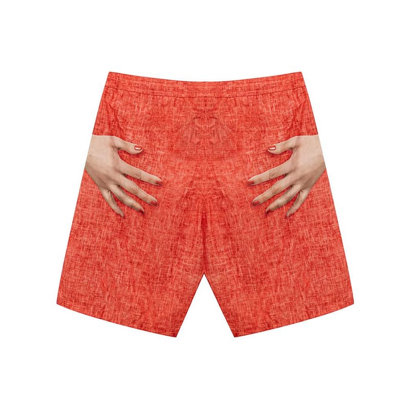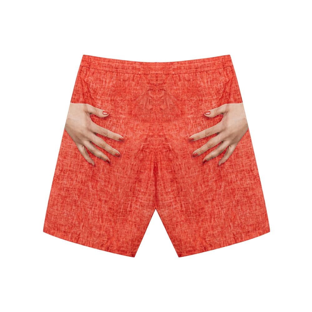 Isaia Hand Print Boxer Costume. In coral red, linen effect, elastic waist with adjustable drawstring, two side welt pockets, medium length, internal mesh. Digital hand print on the side. Super light technical fabric, for quick drying.