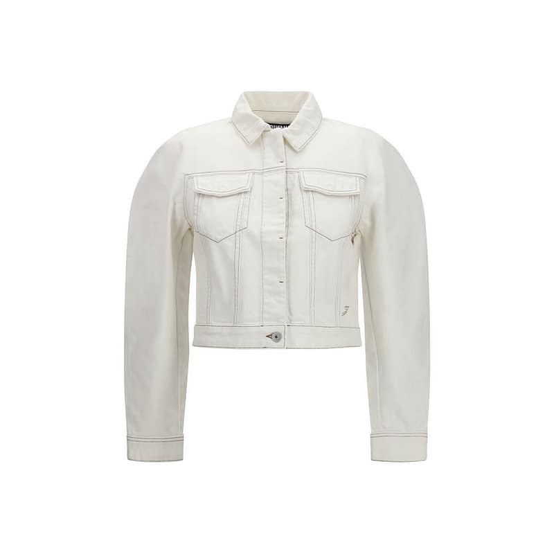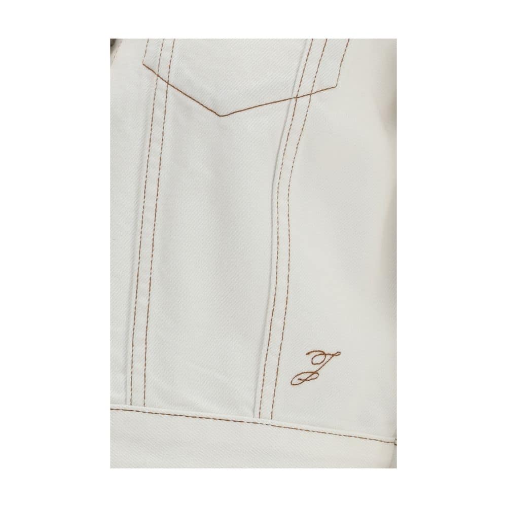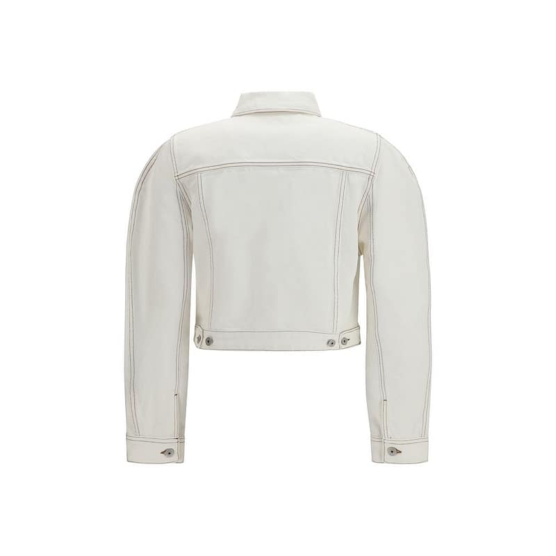 The Ovalo Jacket in denim by Jacquemus is a denim jacket with a curved design, featuring a straight fit that ensures comfort and structure. Made from écru denim with tone-on-tone stitching, it features a pointed collar, back yoke, and patch chest pockets that reinterpret classic workwear in a modern way. The rounded sleeves define the garment’s distinctive silhouette, while the embroidered “J” on the side adds an iconic detail. The model is completed with buttoned cuffs, adjustable tabs at the hem, and engraved metal buttons.