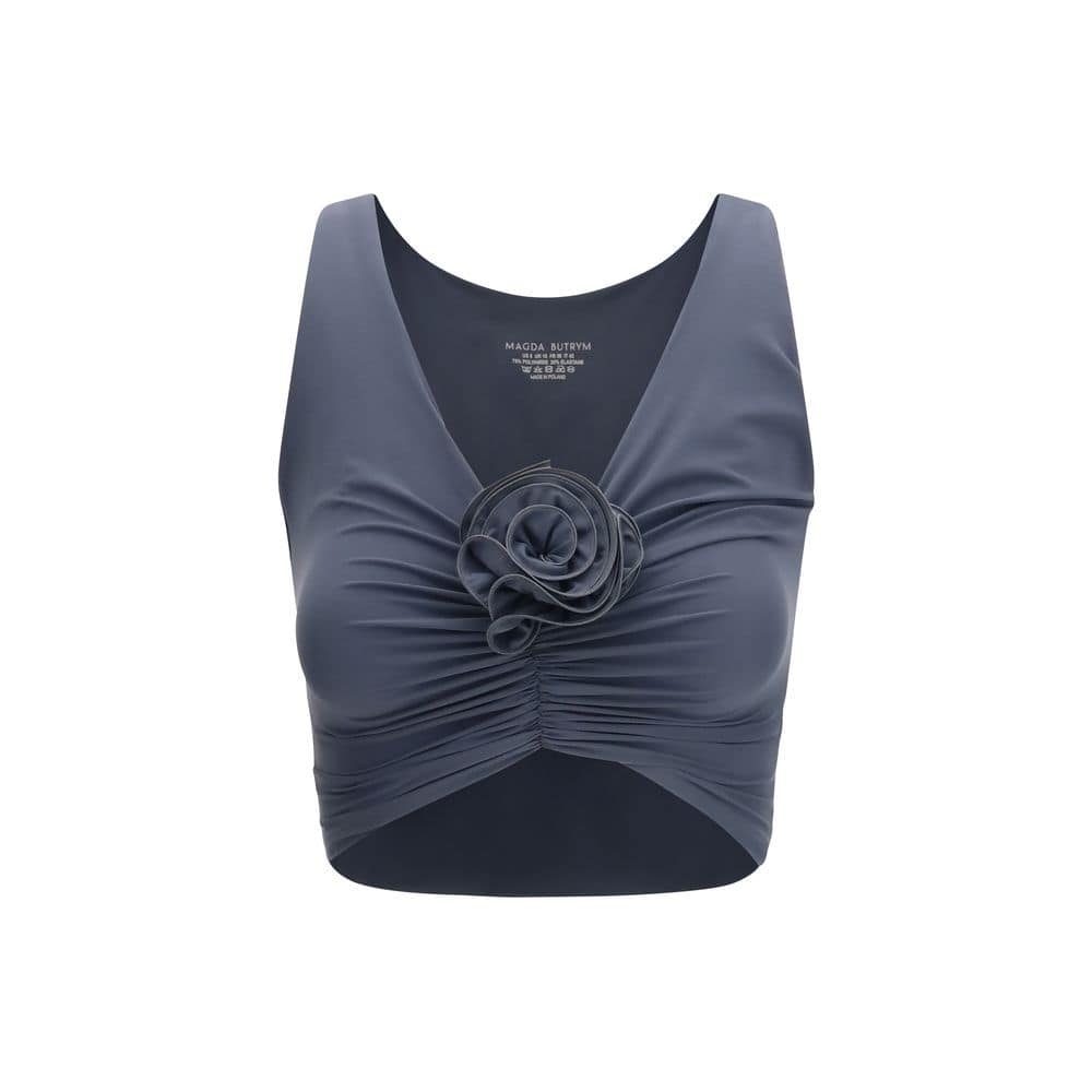 The Ruched Flower Top by Magda Butrym is a stylish and feminine swim top featuring a plunging neckline that enhances the décolletage. The front is defined by ruched detailing, highlighted by a signature floral accent at the center an iconic element of the brand’s aesthetic. The back is clean and provides full coverage, ensuring a perfect balance between sensuality and refinement.