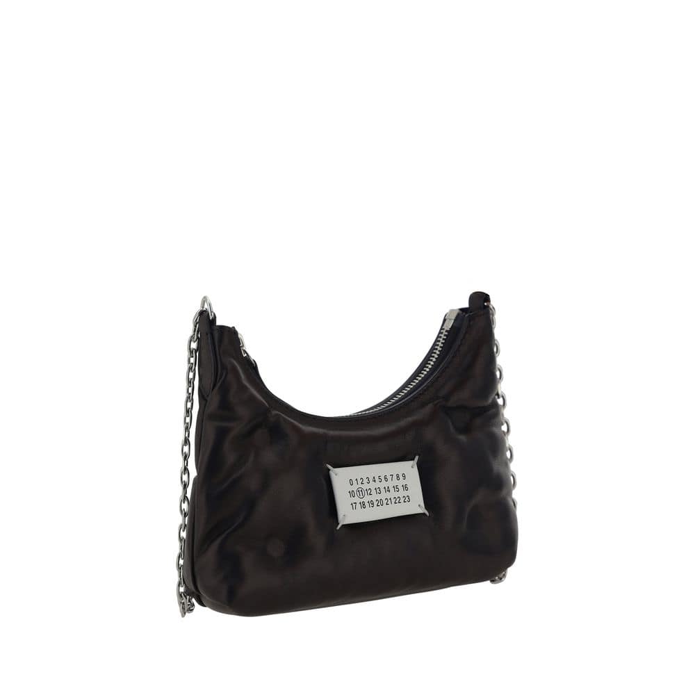 Margiela’s Glam Slam leather Hobo Shoulder Bag combines sophisticated design with functionality. Crafted from high-quality leather, it features an adjustable chain strap with leather detail for personalized comfort. The top closure with double-slider zipper provides convenience and security, while the interior flat pocket adds extra space for essentials. The padded design gives a soft, wrap-around texture, while the iconic signature patch and embroidered monogram on the front enhances its authenticity and distinctive elegance.