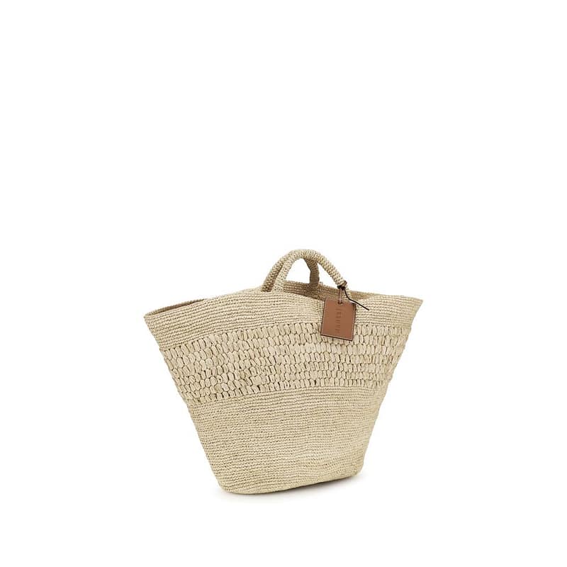 The Fiji raffia Handbag by Manebi reinterprets the traditional raffia basket with a handcrafted construction that alternates two weaving techniques. The wide silhouette is enriched by a central band with a more open weave, which gives depth and volume to the design. The short handles, with a compact and structured weave, are ideal for carrying by hand, while the long handle, made with a wide braid, allows it to be worn comfortably on the shoulder. The leather label adds a distinctive touch, highlighting the artisanal nature and movement of the silhouette.