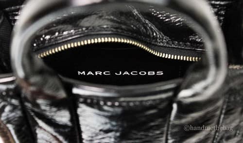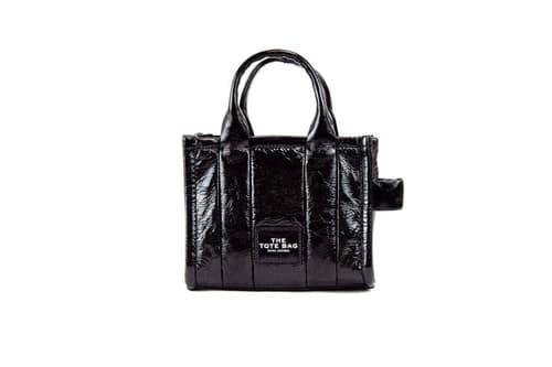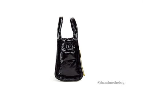 Introducing the exquisite Marc Jacobs The Shiny Crinkle Micro Tote in classic black leather, designed for the modern woman who appreciates both style and functionality. This chic crossbody bag is crafted from high-quality patent leather, ensuring a sophisticated shine and durability for everyday use. Its compact dimensions, measuring 7 inches in width, 5.75 inches in height, and 4 inches in depth, offer a stylish yet practical solution for carrying your essentials.