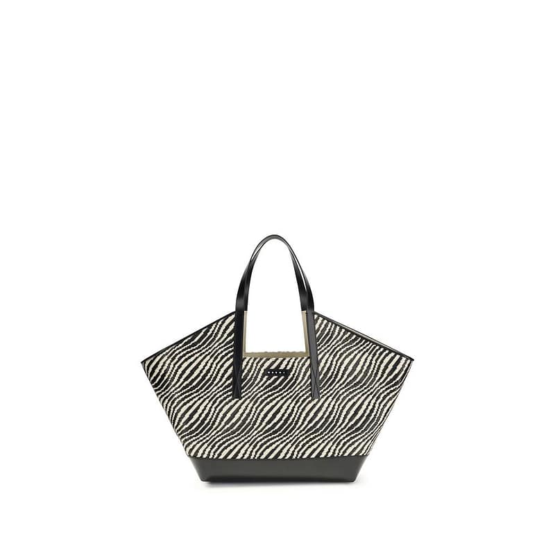 The raffia effect fabric Tote Bag by Marni is made of raffia-effect fabric with a two-tone pattern and features a flared design with a trapezoidal shape and side openings. Leather trim and top handles add a refined touch, while the cotton interior with open pocket ensures practicality. To complete the design, the front leather label with Marni logo signs the accessory with distinctive elegance.