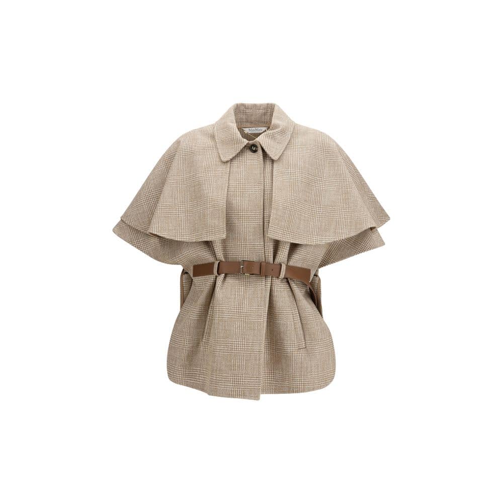 The belted Cape by Max Mara features a layered design with a sophisticated, contemporary appeal. Defined by a pointed collar and front button fastening, it delivers clean, elegant lines. The belted waist allows the fit to be adjusted, enhancing the silhouette and making this piece a refined outerwear option with a distinctive touch.