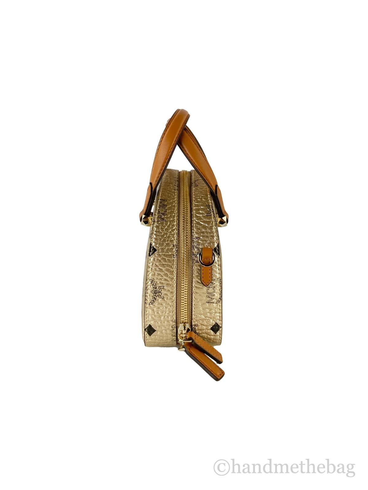 Introducing the MCM Half Moon Mini Round Top Tote Crossbody Bag, a stunning blend of sophistication and functionality. Crafted from premium pebbled and smooth leather, this exquisite bag showcases the iconic MCM Signature Diamond Logo, making it a must-have accessory for any fashion-forward woman. Its Berlin Gold exterior exudes luxury, perfect for elevating any outfit from casual to formal.