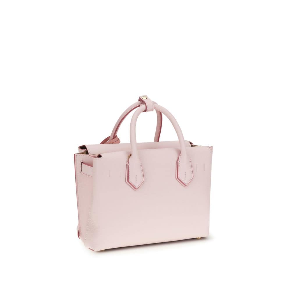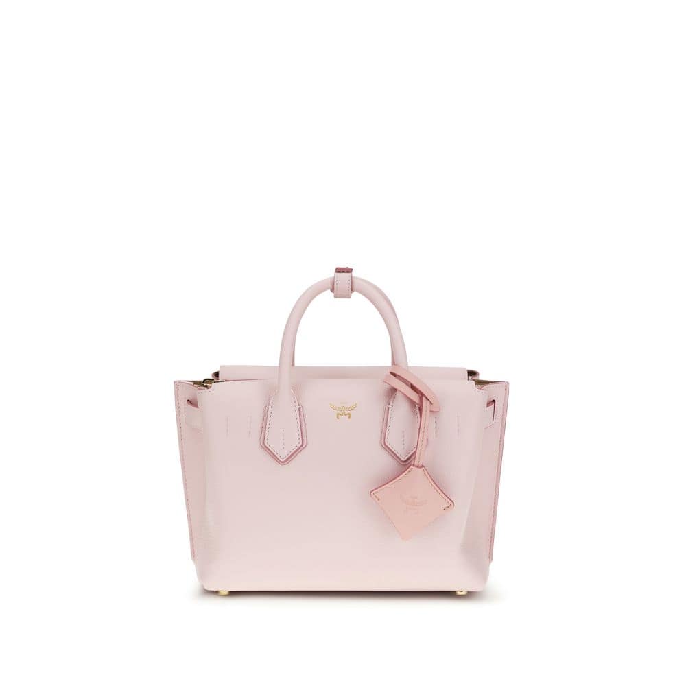 The Milla Handbag by MCM features a trapezoidal silhouette that gently flares upward. Equipped with two handles and a shoulder strap, it can be worn by hand, on the forearm or over the shoulder with great versatility. Gold details, including protective feet, exclusive closure and central “Mode Creation Munich” logo, add elegance, while discreet stitching and contrasting pink piping define a refined, minimalist design.