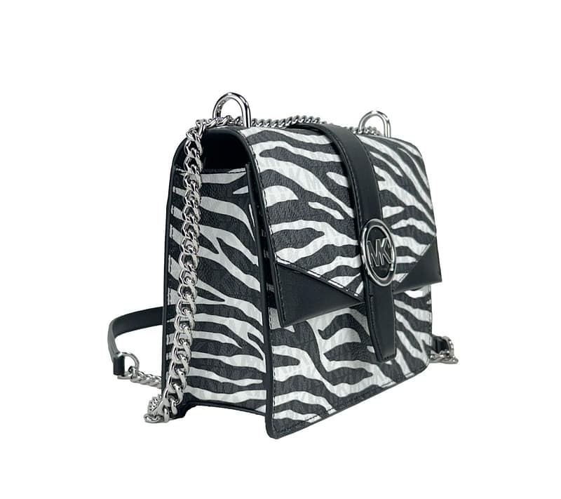 Elevate your accessory collection with the Michael Kors Greenwich Small Print Logo Crossbody Tote Chain Bag. This chic and versatile bag is expertly crafted from high-quality coated PVC, featuring a striking black and white animal print logo that adds a touch of modern sophistication to any ensemble. Designed for the contemporary woman on the go, it offers a compact yet spacious interior with multiple compartments to keep your essentials organized.