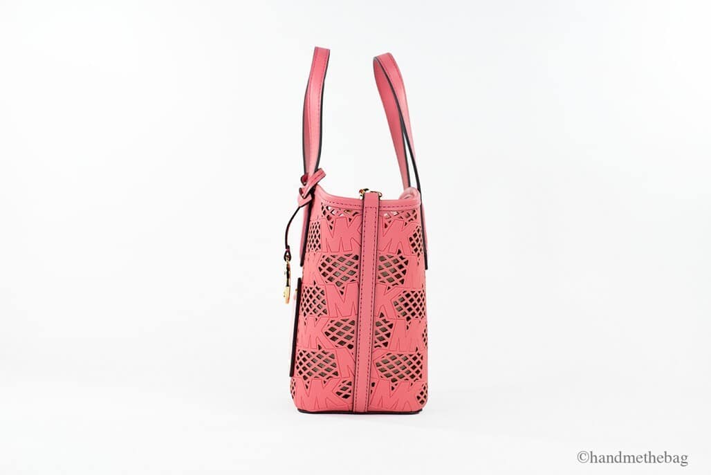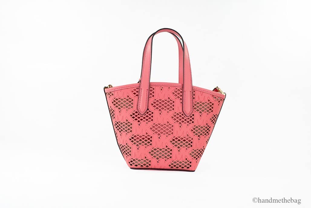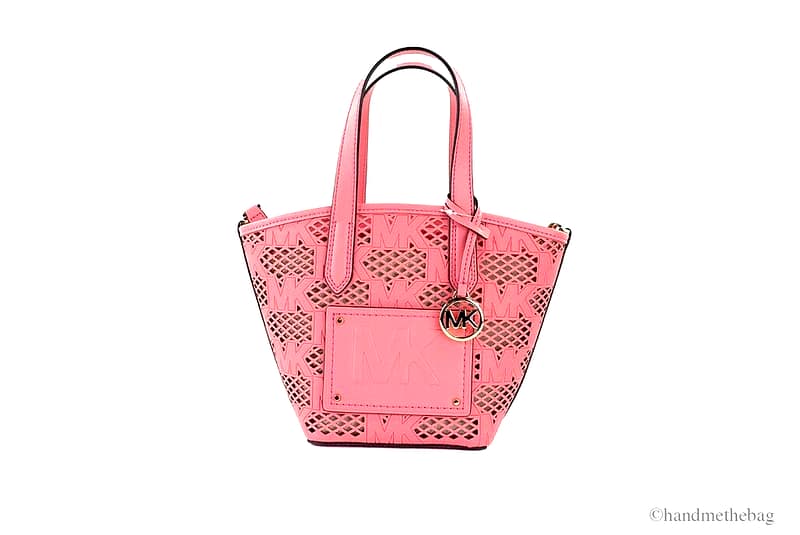 With a captivating tea rose hue and iconic logo pattern, this tote not only elevates your outfit but also showcases your sophisticated taste. Measuring at a compact 11.5″ L x 7.5″ H x 4″ D, it is perfectly sized to carry all you need without being bulky. The double handles ensure a comfortable grip, while the gold hardware adds a touch of elegance, making it a truly eye-catching accessory.