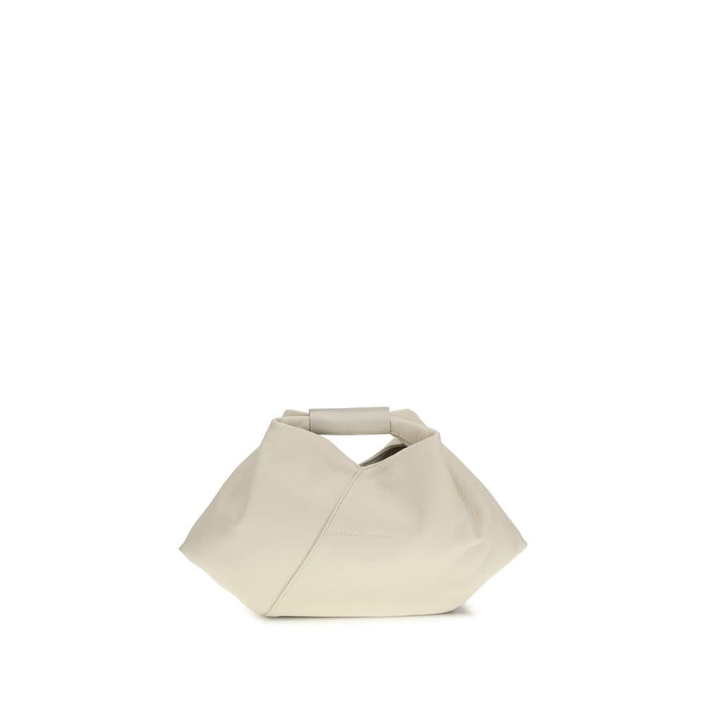 The leather Handbag by MM6 features a draped grained leather design that gives it a unique, structured look. The tubular top handle adds a touch of elegance, while the strap and snap-button closure provides security. Inside, the bag offers a single compartment, combining style and functionality.