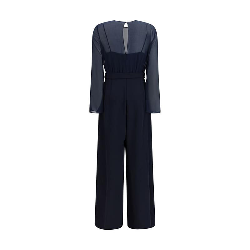 The cady and chiffon Jumpsuit by P.A.R.O.S.H combines fluid elegance with refined construction in a well-balanced design. High-rise palazzo cady trousers create a wide and elongated silhouette, paired with a sheer chiffon long-sleeved blouse that adds lightness and transparency. The design features a crew neckline and a back opening with button closure at the neck, complemented by a rear zip fastening. A removable matching belt defines the waist, while side inseam pockets complete the piece with functional sophistication.