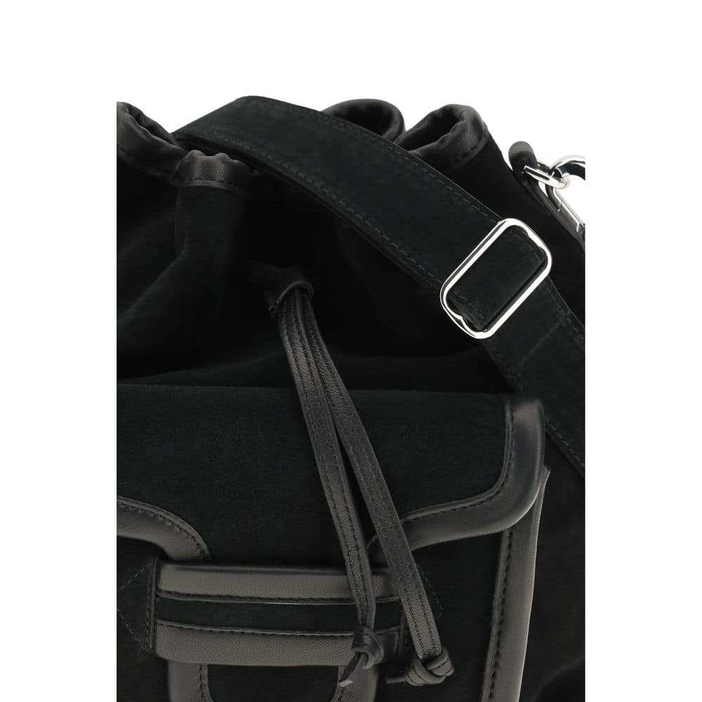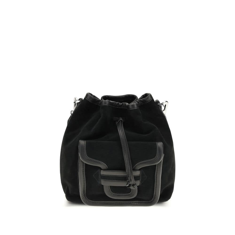 Calfskin Alpha Bucket Bag by Pierre Hardy, suede leather design, drawstring closure at top, adjustable and removable shoulder strap, single interior compartment, front patch flap pocket.