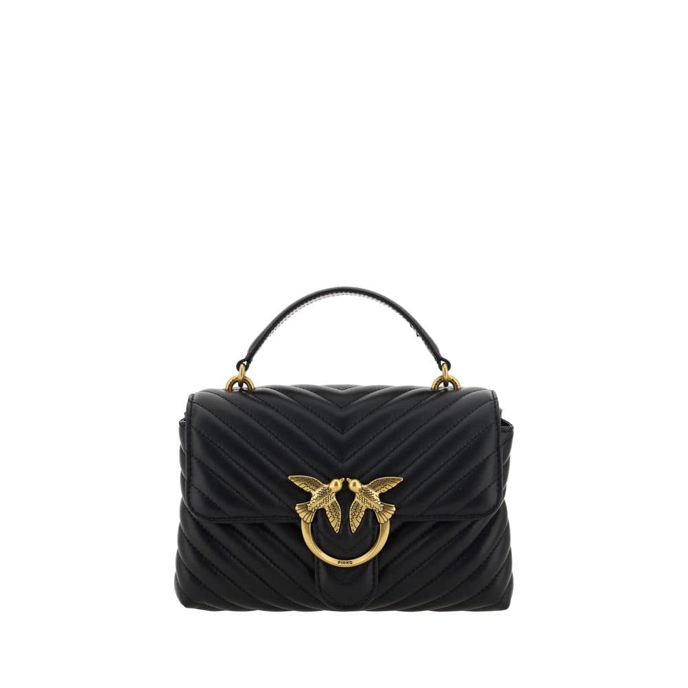 The Calfskin Love Lady Mini Handbag by Pinko, front magnetic flap closure, iconic gold-plated Love Birds logo embossed on the front, quilted and padded design, double interior compartment, removable chain shoulder strap with smooth leather insert, flat rigid top handle, interior flat pocket with zipper, iconic tone-on-tone embroidered brand monogram on the back.