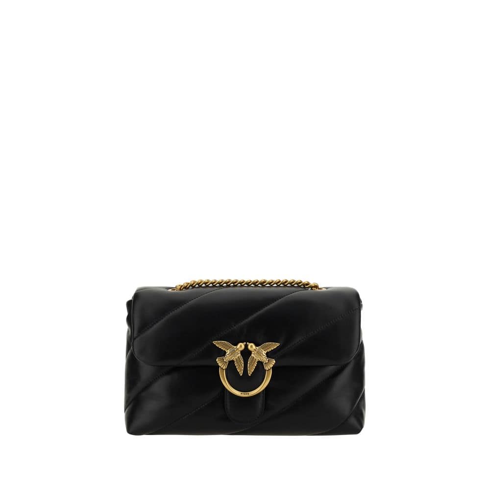 The Love Classic leather Shoulder Bag by Pinko features a quilted and padded design with a front magnetic button closure decorated with the iconic embossed gold-plated Love Birds logo. The interior is organized into two compartments, while a tone-on-tone embroidered monogram stands out on the back. The sliding chain shoulder strap completes the model, combining elegance and practicality.