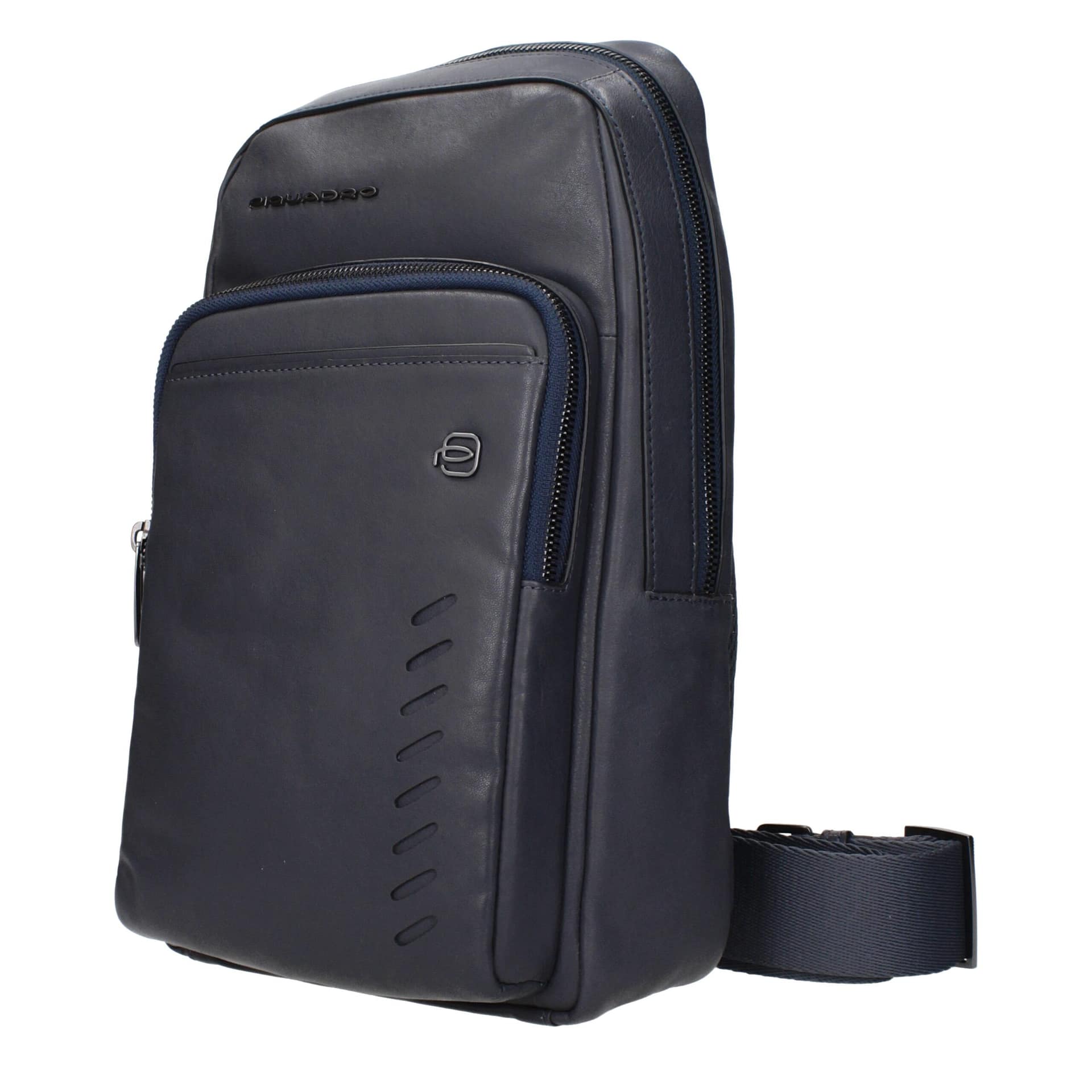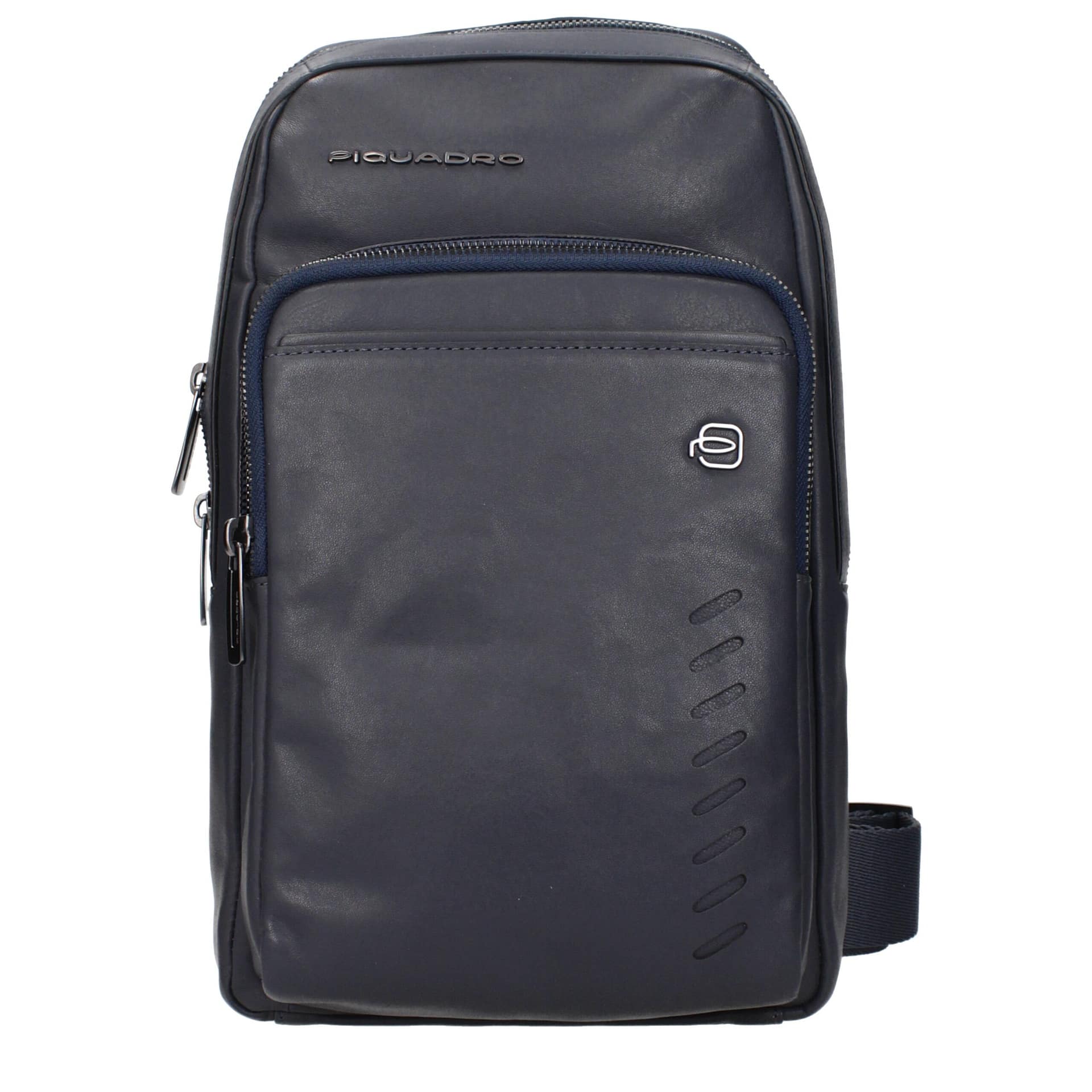 The product with MPN CA5346S110BLU and code F84379 leather in blue is a crossbody bags designed by Piquadro. It has features like front logo, adjustable shoulder.